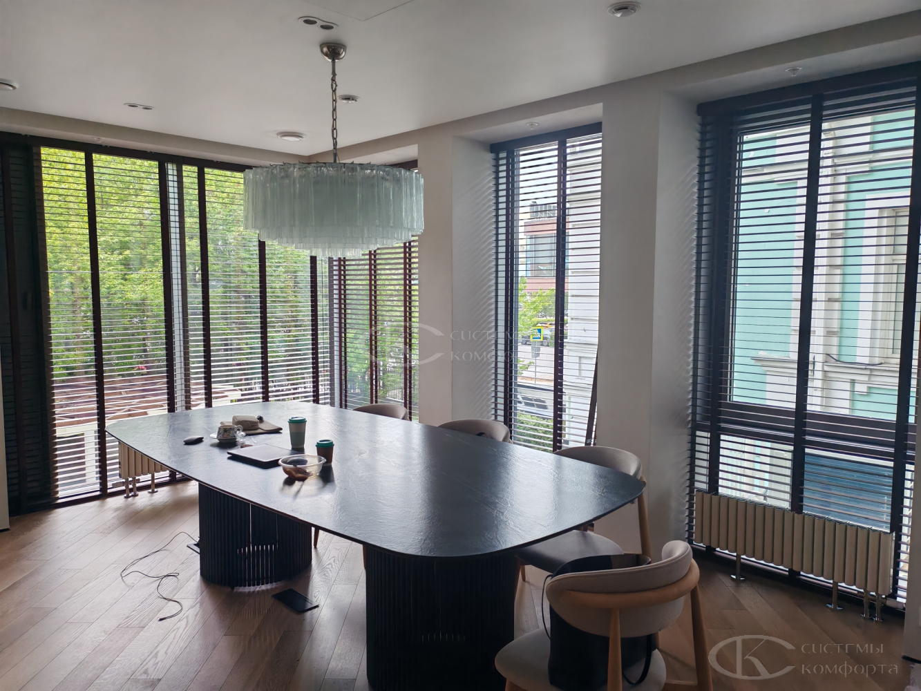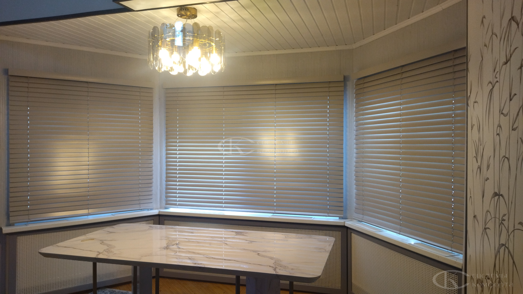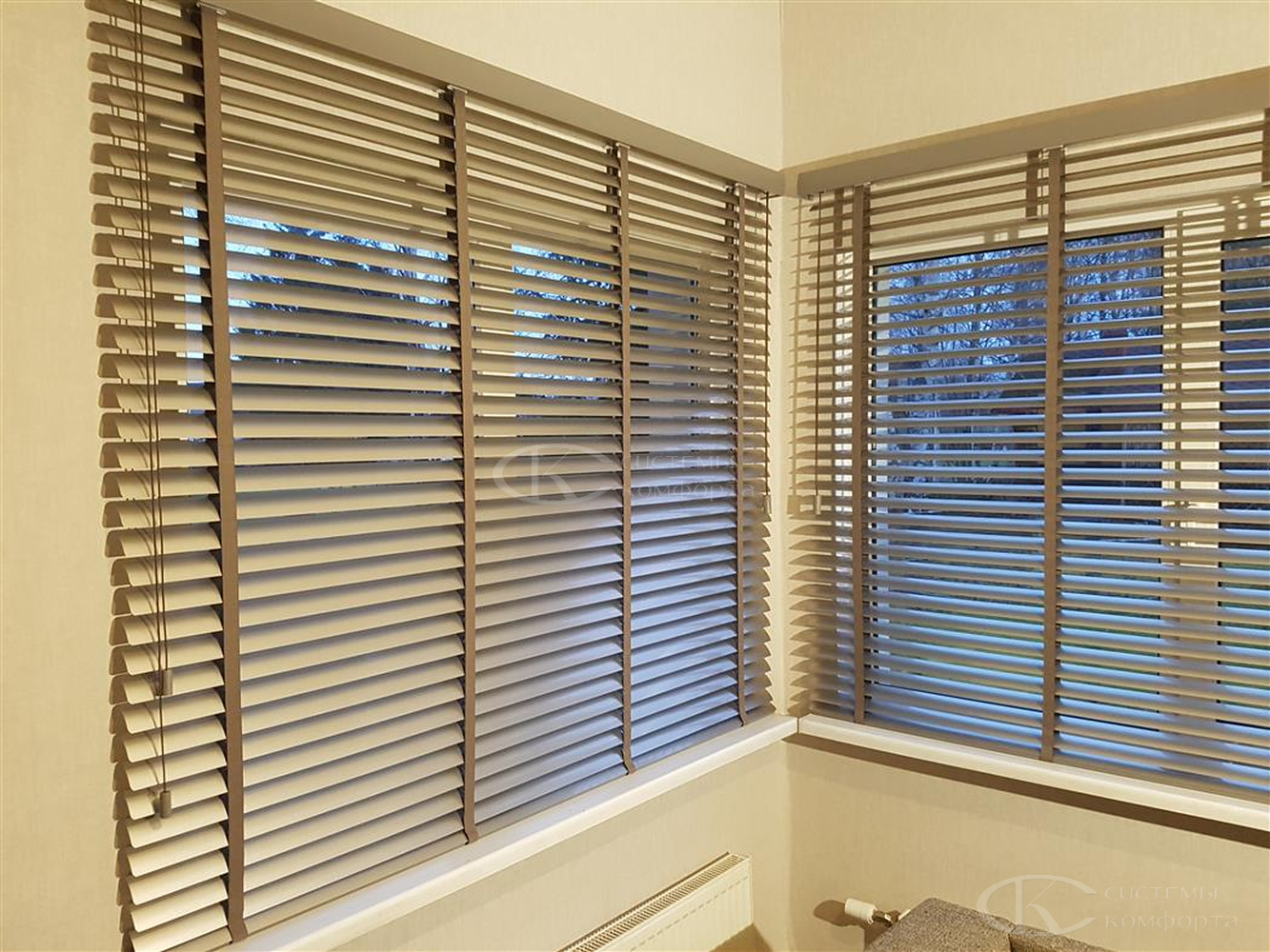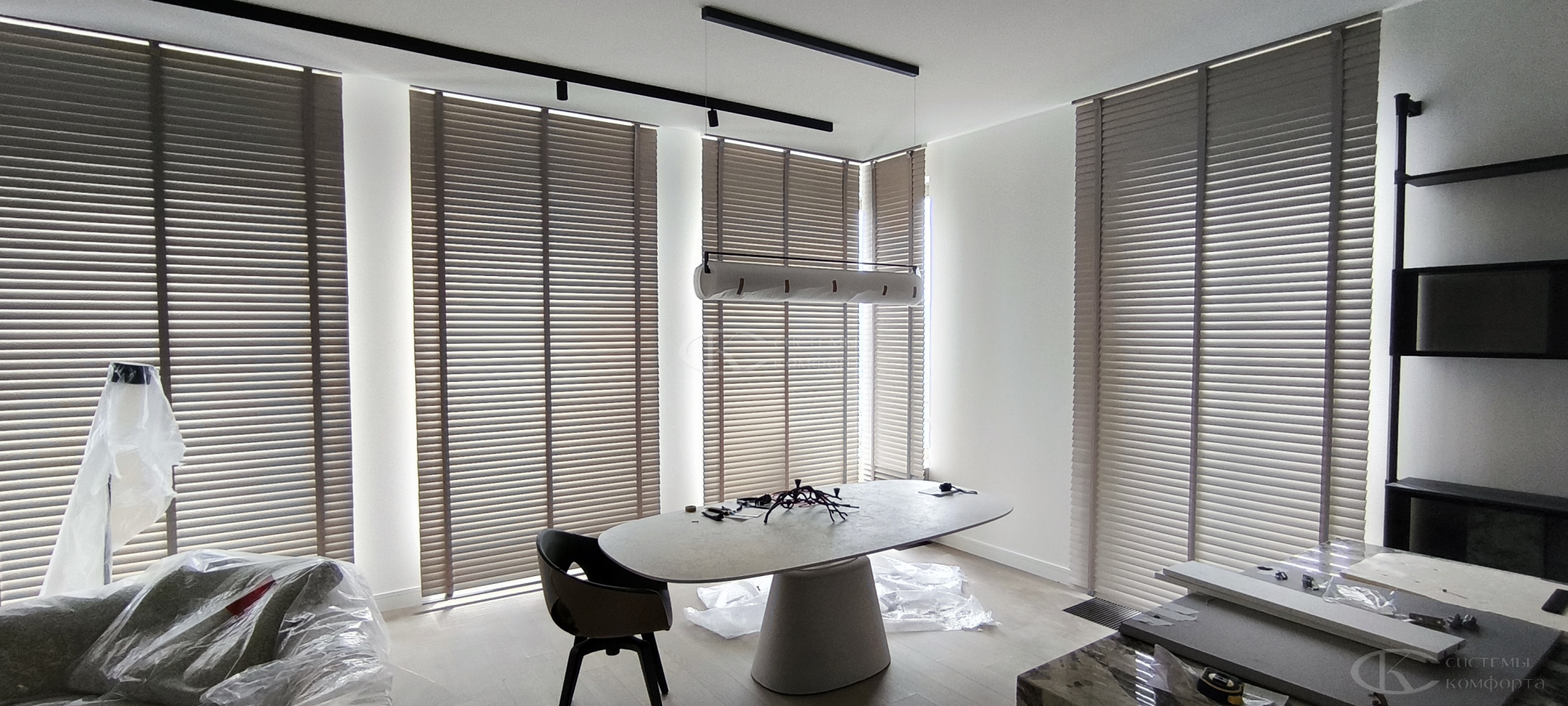 - Тип системы. Горизонтальные алюминиевые – наиболее бюджетный вариант, деревянные, римские шторы или системы с электроприводом будут дороже.