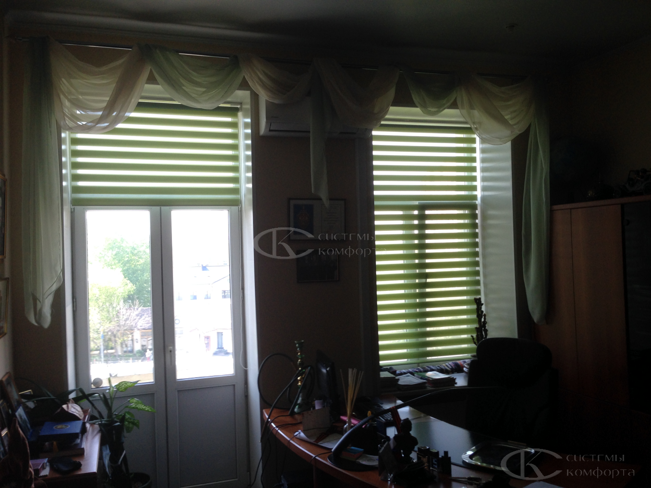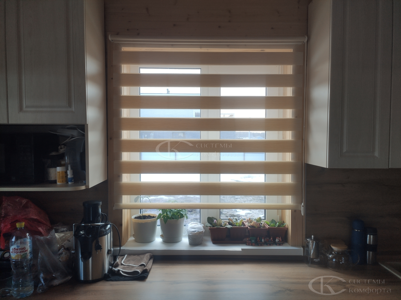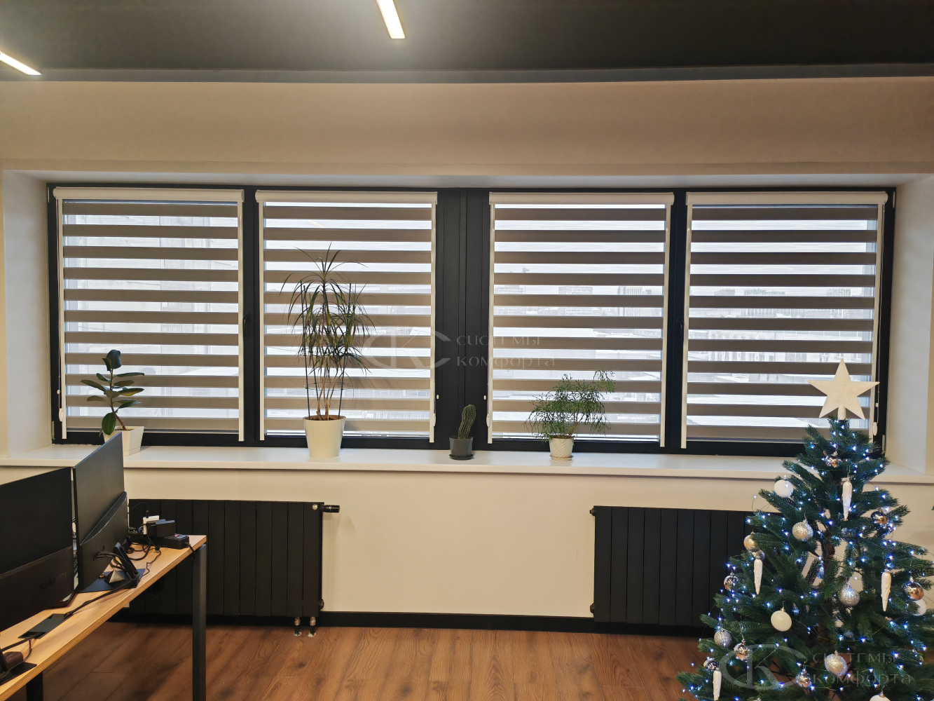 - Рулонные шторы «День-Ночь» («Зебра»). Инновационный продукт, ставший хитом для жилых помещений. Полотно состоит из чередующихся прозрачных и непрозрачных полос. Сдвигая их относительно друг друга, вы плавно регулируете освещенность от полупрозрачного мягкого света до полной приватности. Это удобное и функциональное решение для гостиной или кухни-столовой.