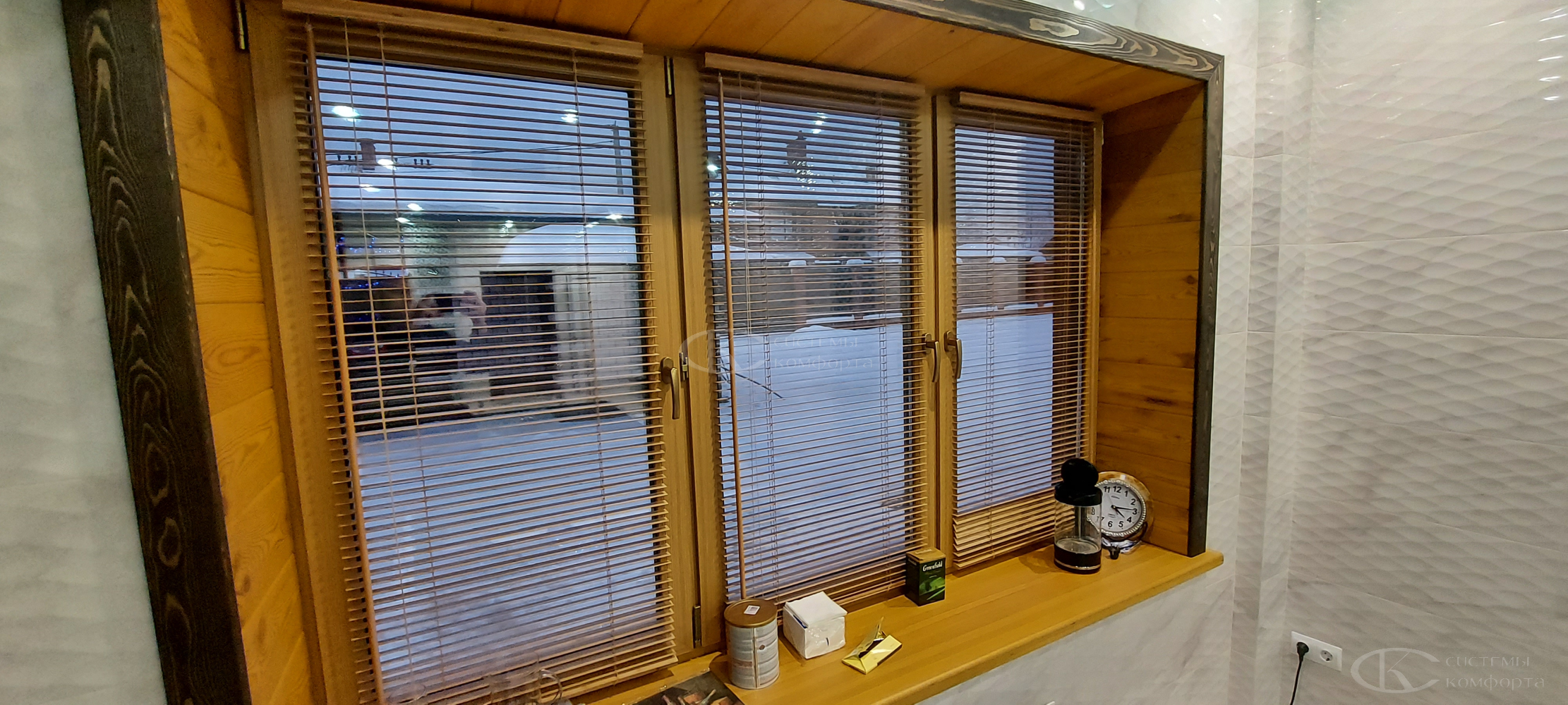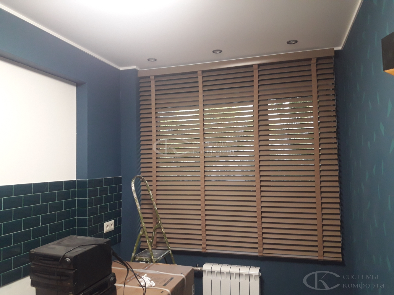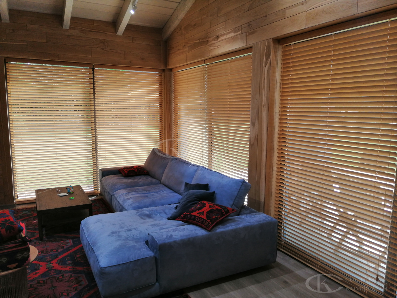 - Деревянные жалюзи. Аристократия среди жалюзи. Они создают в комнате особенную атмосферу тепла, уюта и экологичности. Такие жалюзи для дома отлично подходят для гостиной, кабинета или спальни в классическом или эко-стиле. Важный нюанс: для помещений с высокой влажностью (ванная, неотапливаемая дача) лучше выбрать бамбуковые модели – они более устойчивы.