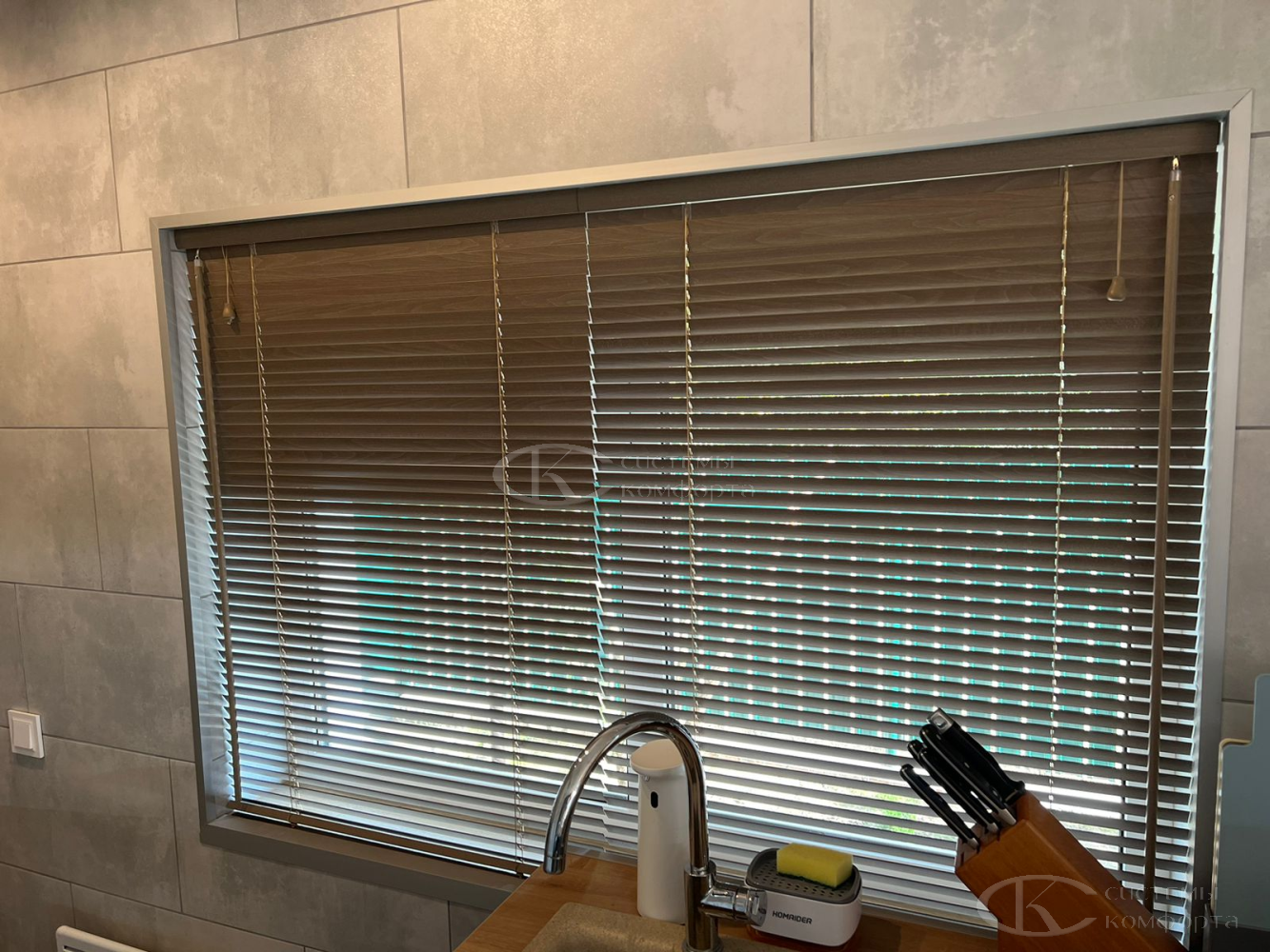 - Алюминиевые ламели. Самый популярный и практичный вариант для дома. Они невероятно легкие, не деформируются со временем, не выгорают на солнце и представлены в сотнях оттенков – от глянцевых белых и серых до имитации дерева (под дерево). Идеальны для кухни, где важна устойчивость к перепадам температуры и влаги, для мансардных окон, где нужна легкость конструкции, и для пластиковых окон в технических помещениях.