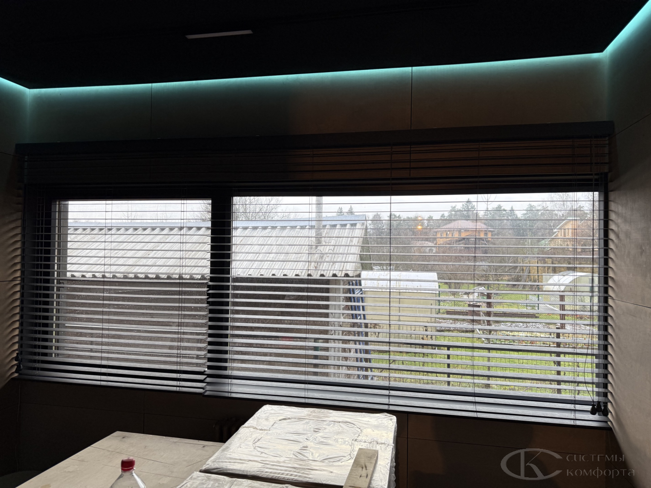 Это тот самый знакомый всем образ: аккуратные горизонтальные ламели на тонких лесках или тросиках. Но современные горизонтальные жалюзи для частных домов ушли далеко вперед от стереотипных «офисных» моделей.