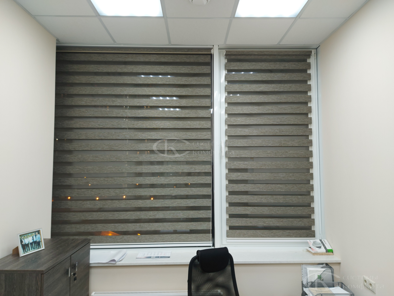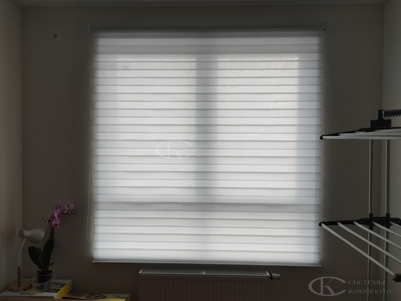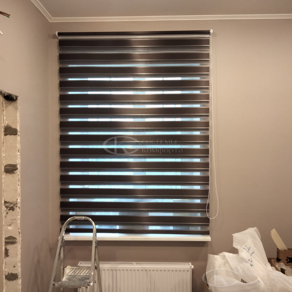 Эту модель штор производят из материалов с разными пропускными характеристиками солнечных лучей. Они позволяют создавать в помещении атмосферу темного и светлого времени суток. Такие шторы называются комбинированными. Второе их название — зебра или комбо.